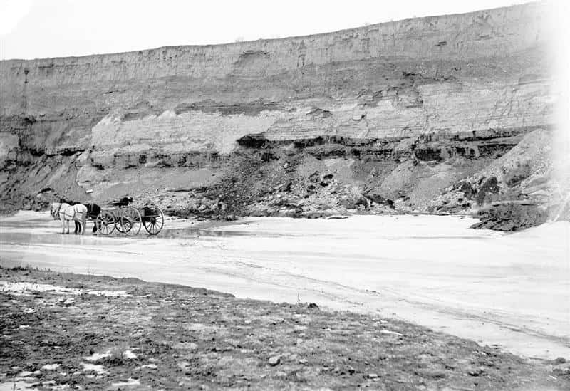 The photo below was taken in 1909 by frontier photgrapher Evelyn Cameron at a coal mine near Marsh Montana. The coal was hand-shoveled from the frozen stream bed alongside an outcropping of coal in to the horse-drawn wagon below to be hauled out and sold. The photo is courtesy of the Montana Historical Society.