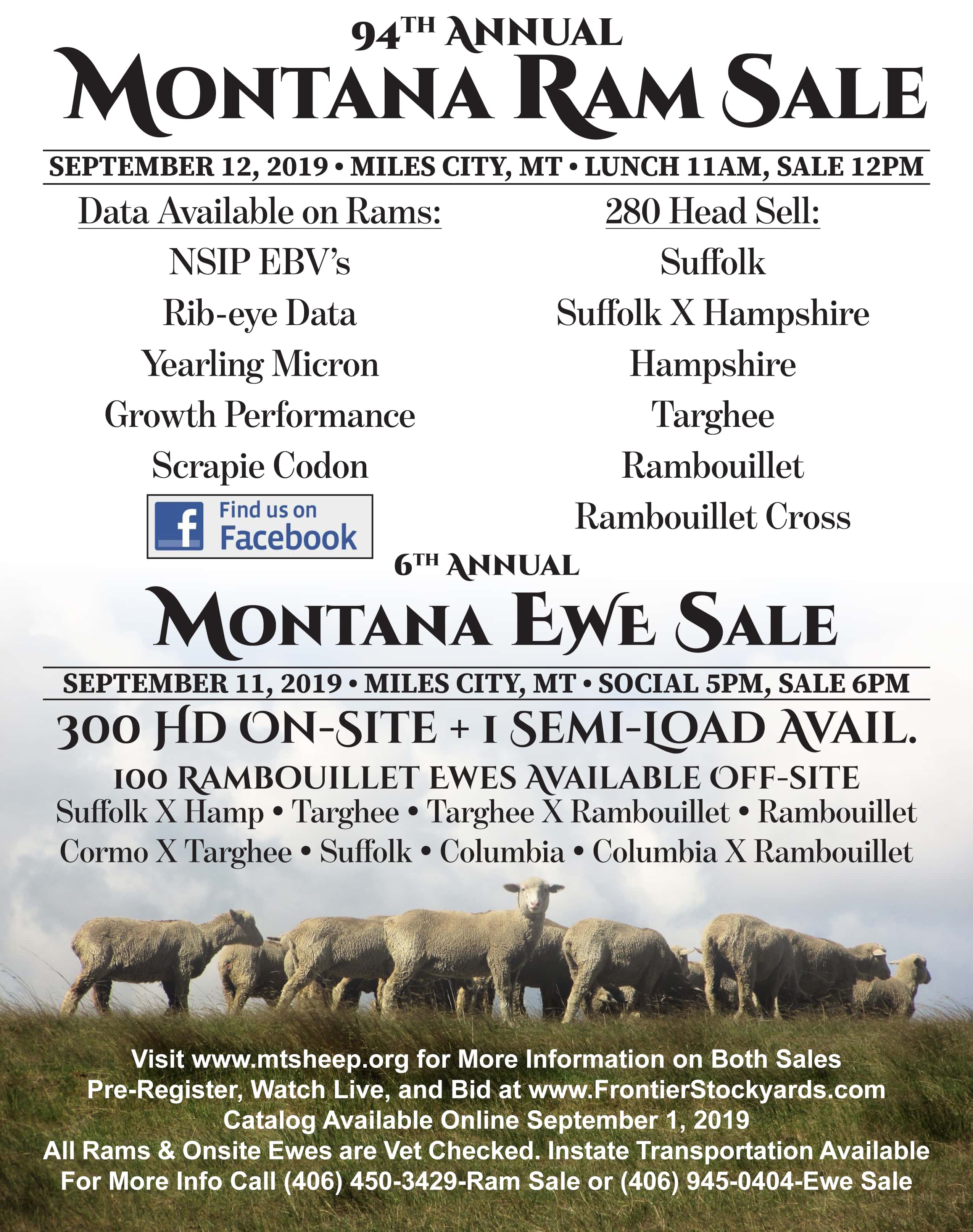 The best rams in Big Sky Country are coming to Miles City for the 94th Annual Montana Ram Sale. The fun will begin on Wednesday, September 11th at 10 am with the MSU Sheep Extension Seminar at the Eastern Montana Fairgrounds followed by a Buyer’s Social at 5pm, and the Ewe Sale at 6pm. 750 head of quality yearling ewes and ewe lambs are consigned from Montana’s premier flocks.