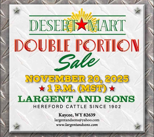 Join Largent and Sons for their annual “Desert-Mart Double Portion” Hereford Sale in Kaycee, Wyoming! Sale day is November 20 at the ranch, lunch at noon, sale starts at 1 p.m.