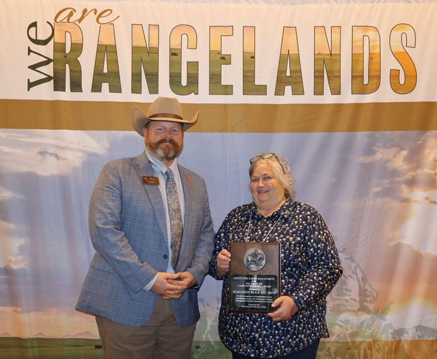 MONTEREY, CALIFORNIA — Marguerite “Meg” Brack Smith, owner and operator of Fleecer Mountain Cattle Company, received the W.R. Chapline Land Stewardship Award at the Society for Range Management’s 79th Annual Meeting in Monterey, California earlier this year.