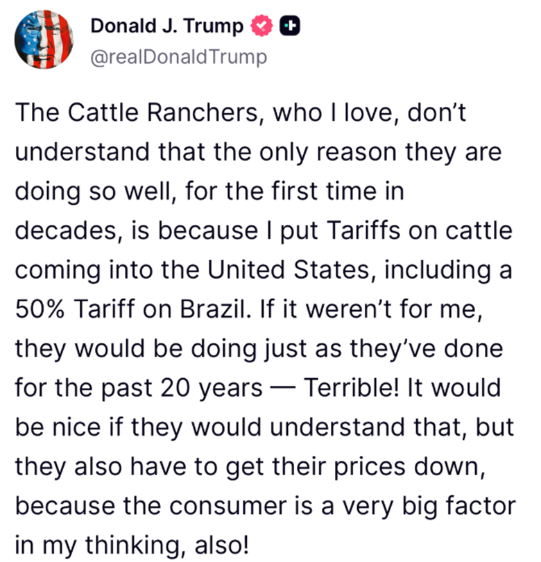 In a social media post, President Trump defended his record of supporting ranchers, saying tariffs on imported cattle and beef have strengthened domestic markets.