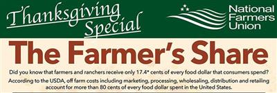 The NFU Farmer’s Share publication says farmers and ranchers get 11.4 cents of every dollar that consumers spend on their turkey day dinner.